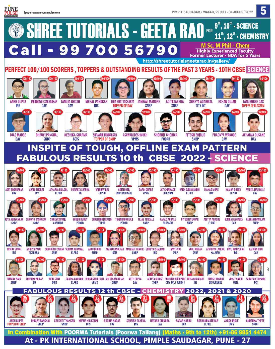 Results of 2020 – CBSE –10 th SCIENCE AND 12 th CHEMISTRY